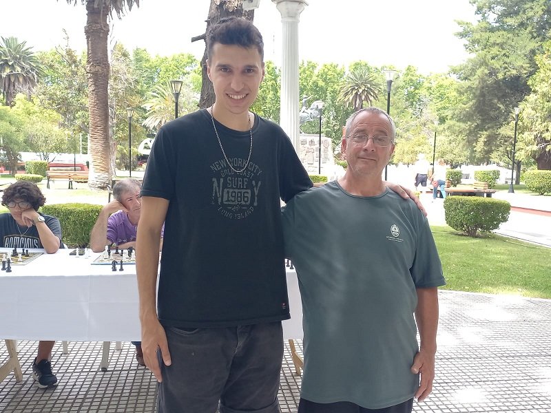 Este docente estuvo en la organización de un evento en la plaza San Martín, del que participó Indalecio López Miller (foto con Siracusa), el campeón mendocino, de 26 años. Varios jugadores tuvieron la oportunidad de enfrentarlo al mismo tiempo, generando un momento de gran entretenimiento y estrategia.