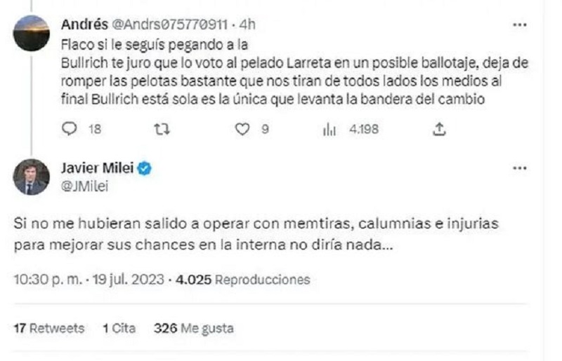 “Si no me hubieran salido a operar con mentiras, calumnias e injurias para mejorar sus chances en la interna no diría nada…”, respondió Milei a un usuario de Twitter que lo cuestionó por criticar a Bullrich.