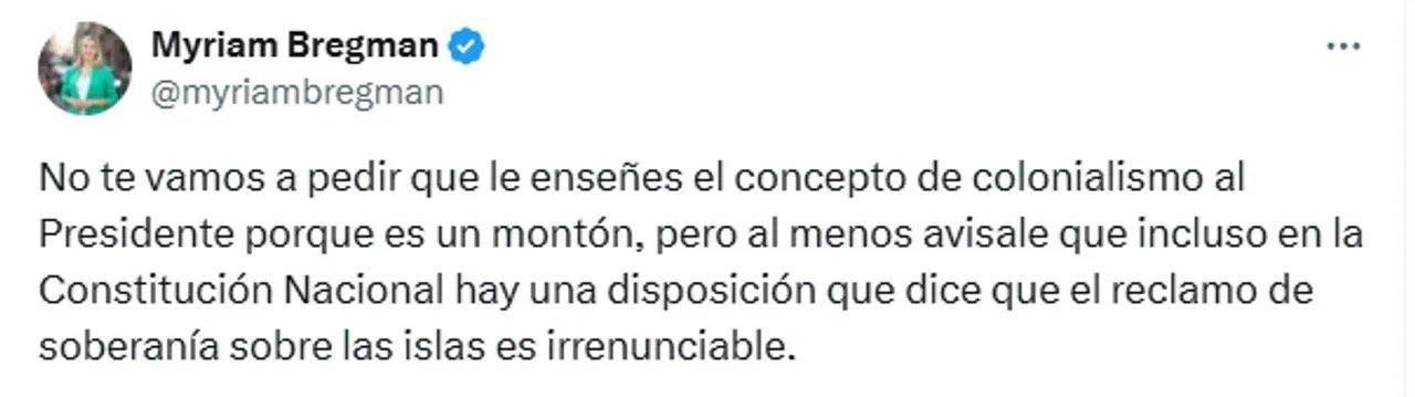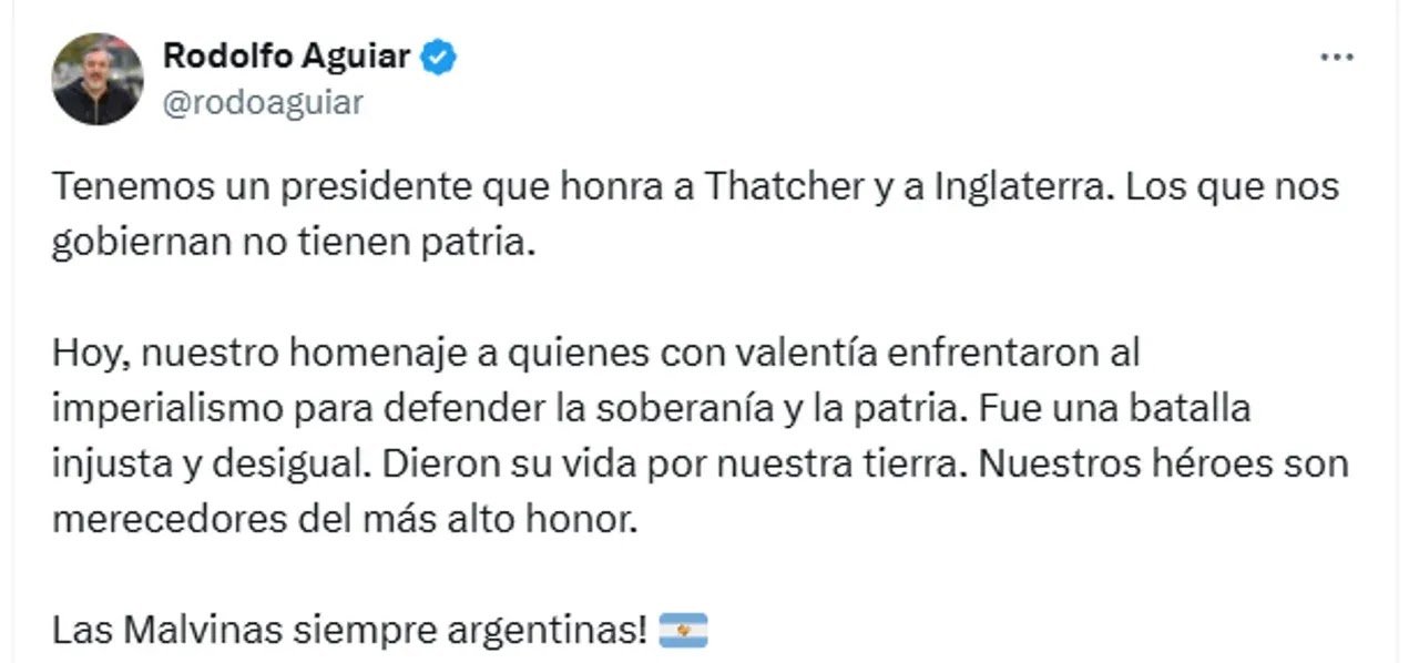 En tanto, Myriam Bregman, diputada del FIT, manifestó su “repudio total” a Milei por “admirar a la criminal Margaret Thatcher”, y La Cámpora difundió un video con el mensaje: “No hay nada que se pueda recuperar de rodillas”.