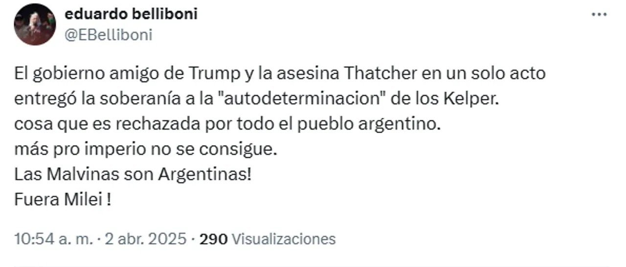 El dirigente social Eduardo Belliboni acusó al Gobierno de “entregar” la soberanía al aceptar la autodeterminación de los kelpers, algo que, dijo, “es rechazado por todo el pueblo argentino”. Además, recordó que el oficialismo es “amigo de Trump y de la asesina Thatcher”, y remató: “¡Fuera Milei!”.