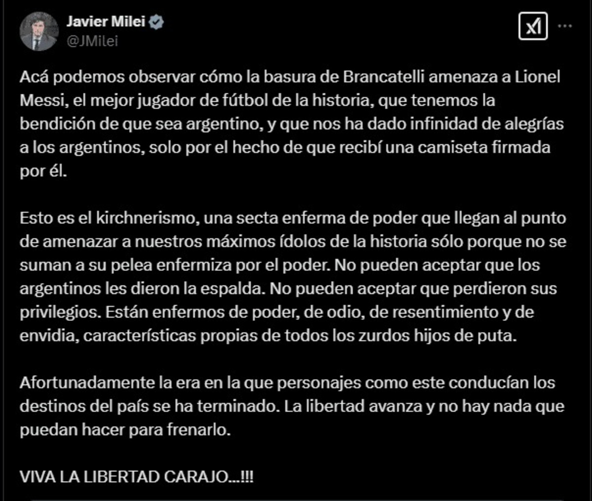 Finalmente, cerró su mensaje con su habitual arenga: “Afortunadamente, la era en la que personajes como este conducían los destinos del país se ha terminado. La libertad avanza y no hay nada que puedan hacer para frenarlo. ¡Viva la libertad, carajo!”.