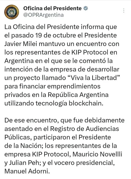 El vínculo con KIP Protocol comenzó el 19 de octubre de 2024, cuando el jefe de Estado mantuvo una reunión con los representantes de la empresa, Mauricio Novelli y Julian Peh. Posteriormente, el 30 de enero de 2025, Milei recibió en Casa Rosada a Hayden Mark Davis, presentado por KIP Protocol como proveedor de la infraestructura tecnológica del proyecto. Según aclaró el Gobierno, Davis no tiene ninguna vinculación con la administración nacional.