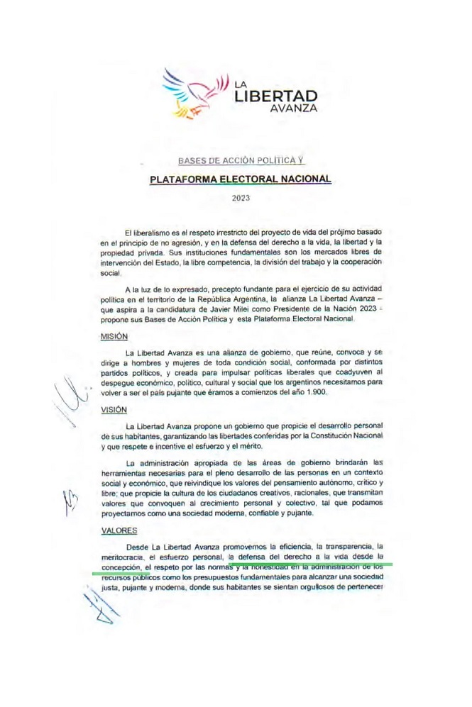 El precandidato de La Libertad Avanza, Javier Milei, presentó ante la Justicia su plataforma electoral en la que dejó por escrito todas las medidas que propone avanzar. Muchas de ellas ya se conocían, como la dolarización de la economía, facilitar el acceso a las armas o derogar la ley del aborto, al solicitar el reconocimiento de la personalidad jurídica para presentarse a las próximas elecciones nacionales.