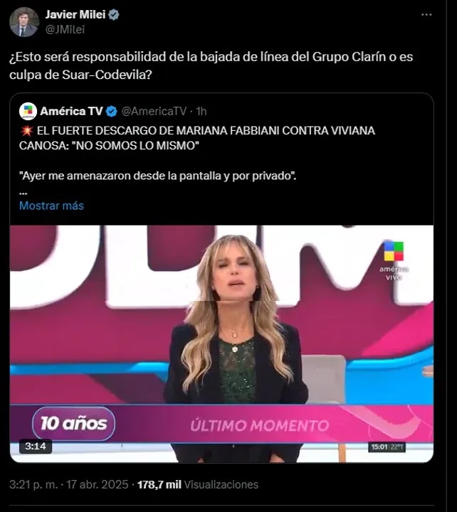 Javier Milei se metió en el conflicto entre Viviana Canosa y Mariana Fabbiani y apuntó contra Adrián Suar: “¿Es culpa del Grupo Clarín o de Suar-Codevila?”.