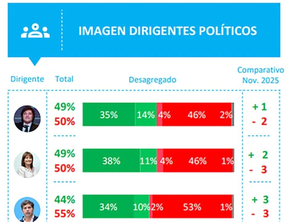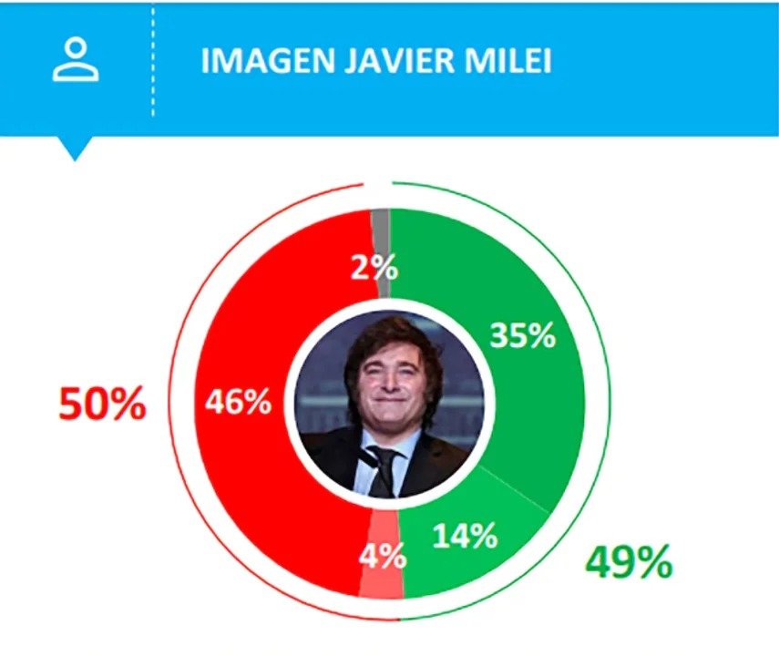 El presidente Javier Milei y la actual senadora por La Libertad Avanza (LLA) Patricia Bullrich tienen un 49% de imagen positiva como funcionarios, para casi la mitad de los ciudadanos encuestados.