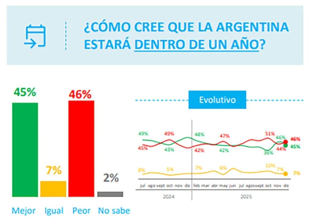 Para finalizar, con respecto al último tramo que le queda al mandato de La Libertad Avanza, el 45% de los encuestados considera que en 2026 habrá una mejor significativa; el 46% cree totalmente lo contrario y el 7% sostiene que no habrá ningún cambio, ni favorable ni negativo.