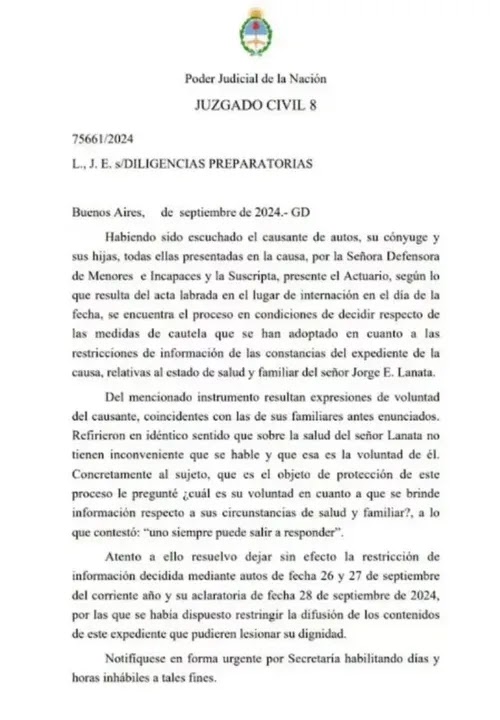 “Resultan expresiones de voluntad del causante, coincidentes con las de sus familiares antes enunciados. Refirieron en idéntico sentido que sobre la salud del señor Lanata no tienen inconveniente que se hable y esa es la voluntad de él”, expresó la jueza.