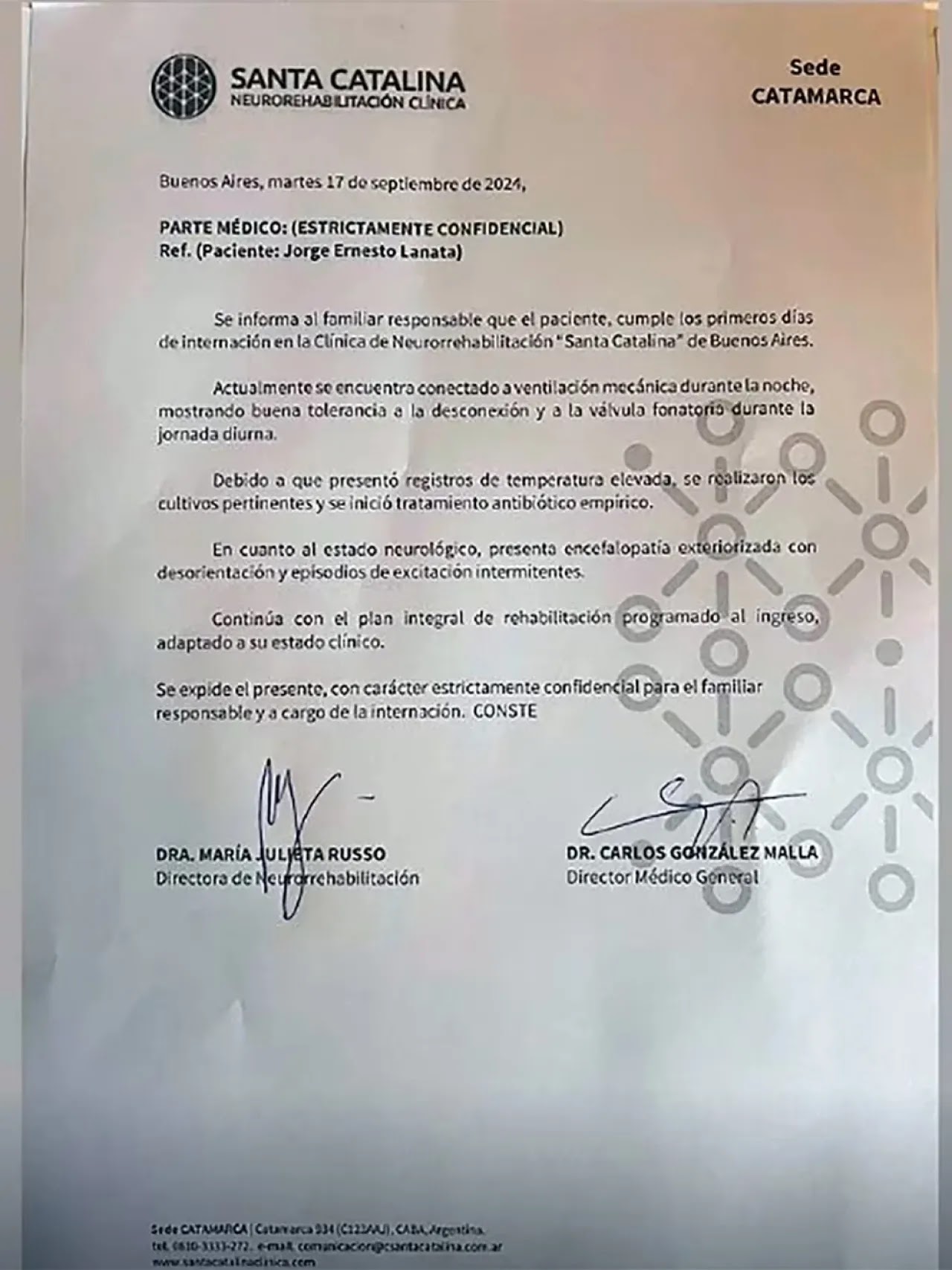 “Se informa al familiar responsable que el paciente cumple los primeros días de internación en la Clínica de Neurorehabilitación Santa Catalina de Buenos Aires. Actualmente, se encuentra conectado a ventilación mecánica durante la noche, mostrando buena tolerancia a la desconexión y a la válvula fonatoria durante la jornada diurna”, dicta el documento.