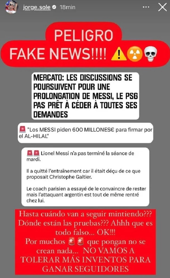 “¡Peligro, fake news! ¿Hasta cuándo van a seguir mintiendo? ¿Dónde están las pruebas? Ah, que es todo falso…OK. Por muchos (emoji de alarma) que pongan no se crean nada. No vamos a tolerar más inventos para ganar seguidores”, escribió Jorge en su cuenta de Instagram.