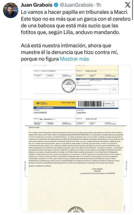 “Acá está nuestra intimación, ahora que muestre él la denuncia que hizo contra mí porque no figura en ningún juzgado que yo esté denunciado por el GCBA por comedores fantasma ni listados de muertos ¿O será que mintió para la tribuna y no presentó nada en mi contra?”, sostuvo en su cuenta de X.