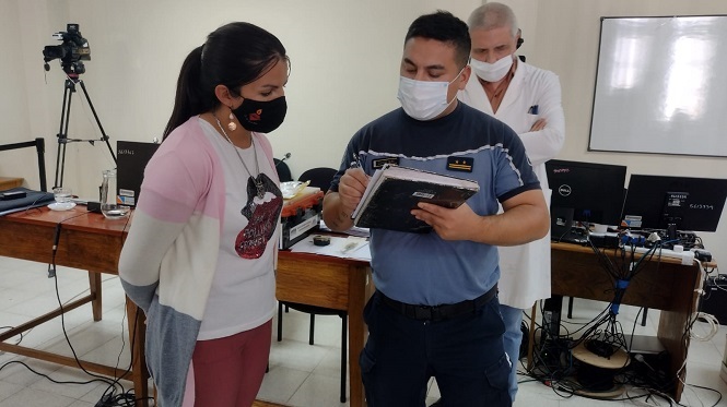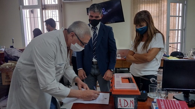 Durante la mañana de hoy se realizó en la sala de debate el levantamiento de las muestras genéticas de los imputados (saliva) a cargo del Dr. Carabajal (del Cuerpo médico forense) y de la plantigrafia a Lucía Carrasco, por parte de policía científica, para determinar cuánto calza la imputada.