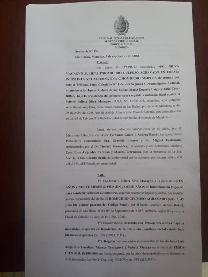 En los alegatos, el fiscal Fernando Guzzo había solicitado 14 años de cárcel para la acusada, mientras que el querellante había pedido prisión perpetua y la defensa, la absolución. Sin embargo los jueces Rodolfo Luque, Julio Bittar y María Eugenia Laigle entendieron que, lo ocurrido el 9 de septiembre de 2017 frente a Mona Bar, fue un homicidio culposo agravado, y que lo que correspondía era una pena de 3 años y 9 meses de prisión. “La prueba ha sido analizada con mucho detenimiento en este juicio y esta sentencia. Los fundamentos serán leídos a partir del quinto día hábil”, señaló el presidente del tribunal, Rodolfo Luque.