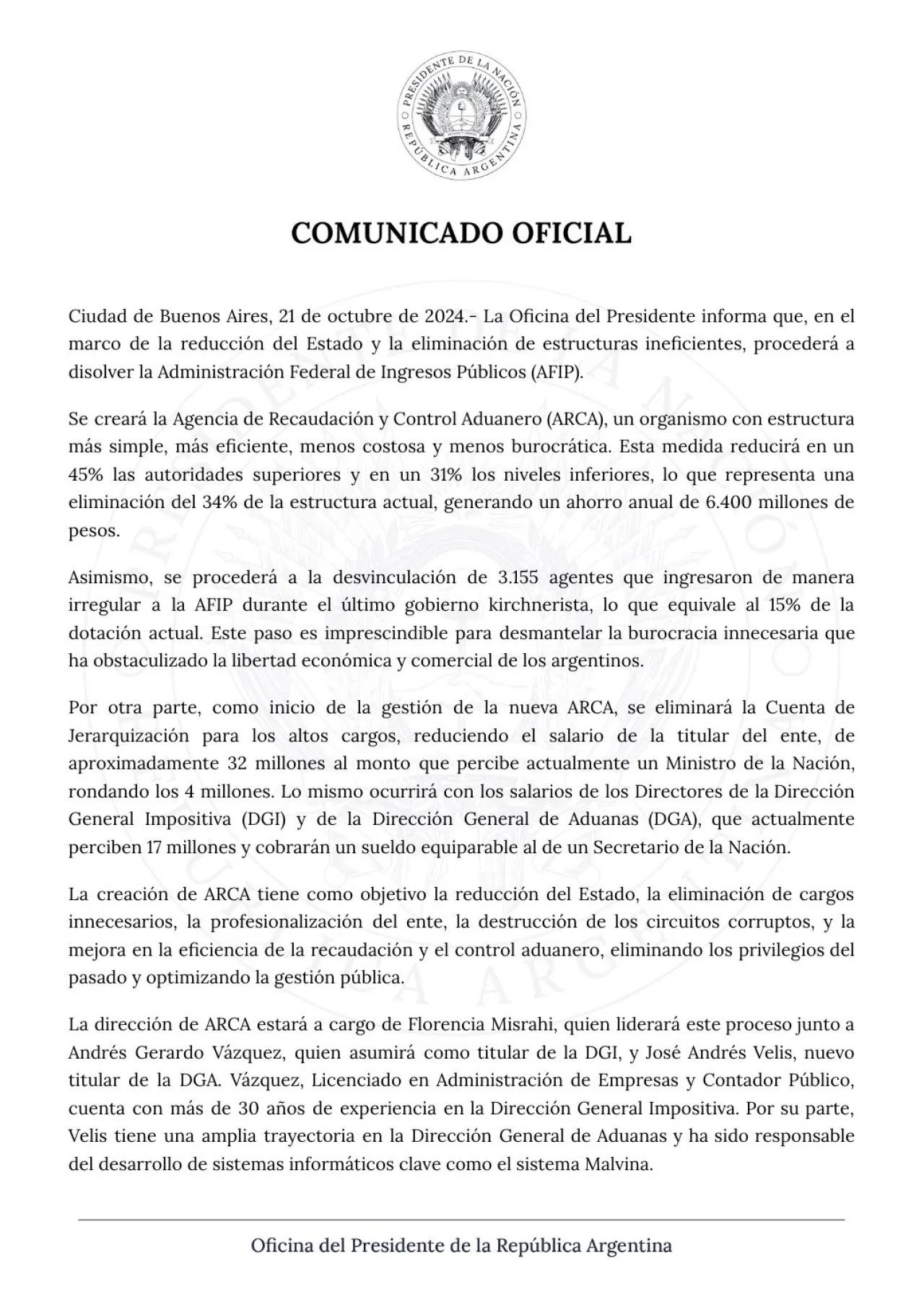 “La Oficina del Presidente informa que, en el marco de la reducción del Estado y la eliminación de estructuras ineficientes, procederá a disolver la Administración Federal de Ingresos Públicos (AFIP).