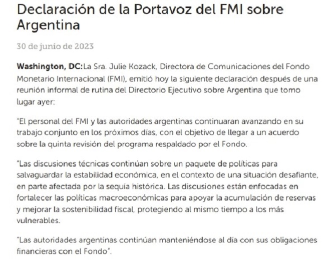 Julie Kozack, directora de Comunicaciones del FMI, emitió una declaración después de una reunión informal de rutina del Directorio Ejecutivo sobre Argentina.
