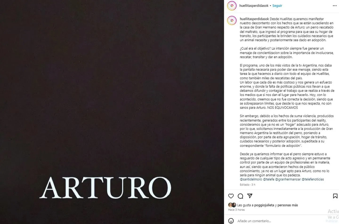 “Desde Huellitas queremos manifestar nuestro descontento con los hechos que se están sucediendo en la casa de Gran Hermano respecto de Arturo; un perro rescatado del maltrato, que ingresó al programa para que sea su hogar de tránsito, los participantes le brinden los cuidados necesarios que un animal necesita y posteriormente sea dado en adopción”, comenzó el posteo.