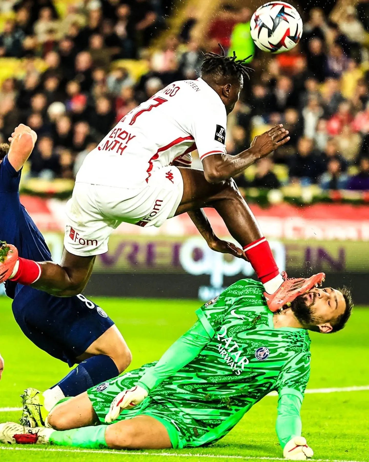 El arquero italiano del Paris Saint Germain de Francia, Gianluigi Donnarumma, recibió un impactante planchazo por el defensor marfileño del Mónaco, Wilfried Stephane Singo, en el partido que disputaron por la fecha 16 de la Ligue 1.