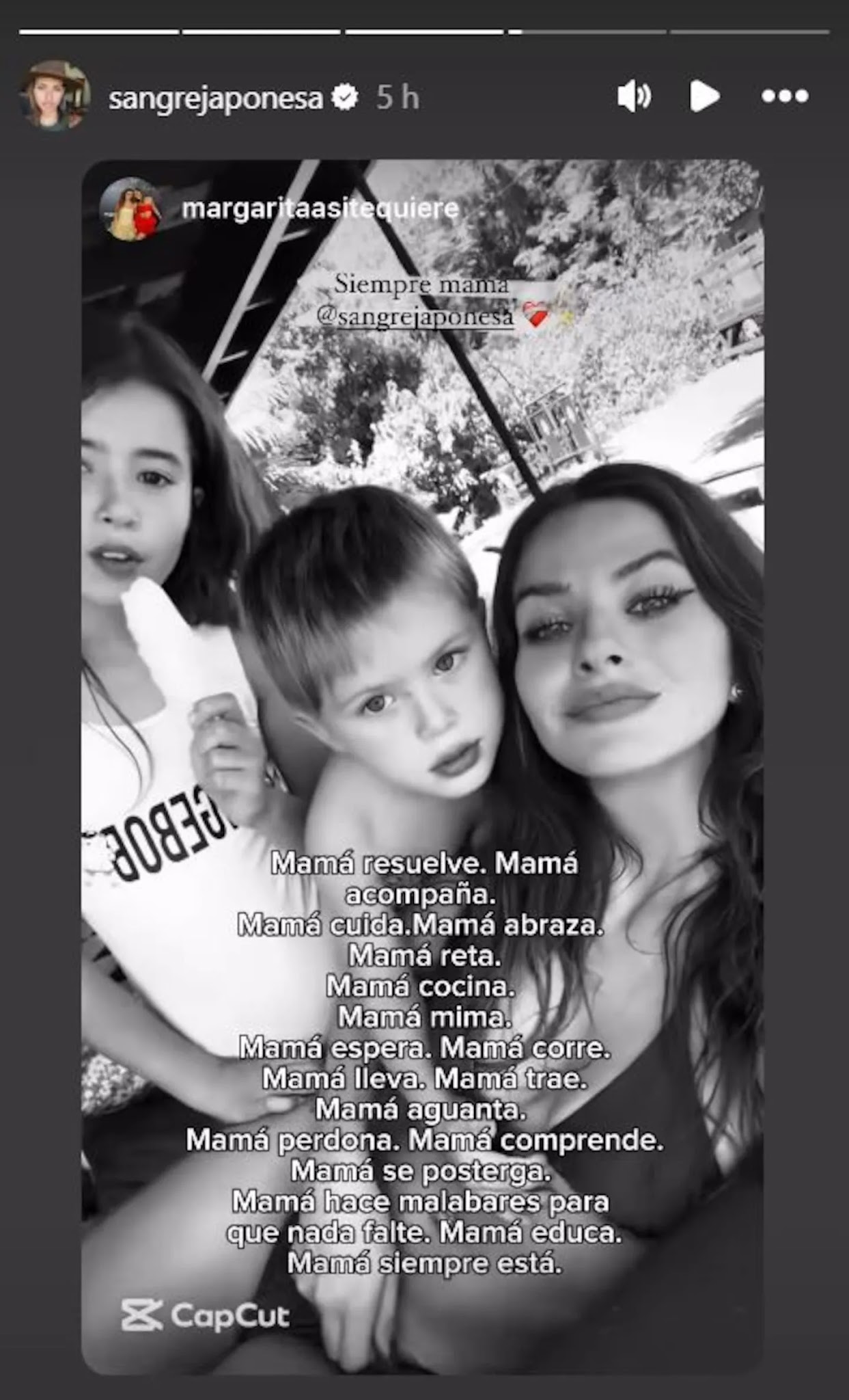 “Mamá resuelve. Mamá acompaña. Mamá cuida. Mamá reta. Mamá cocina. Mamá mima. Mamá espera. Mamá corre. Mamá lleva. Mamá trae. Mamá aguanta. Mamá perdona. Mamá comprende”, dice el texto que acompaña al posteo.