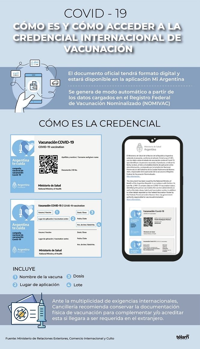 La Cancillería aclaró que, ante la variabilidad de exigencias de los países para viajes internacionales, y considerando que la Organización Mundial de la Salud (OMS) aún no se pronunció sobre una certificación de alcance global, se recomienda a las personas que viajen al exterior consultar las medidas sanitarias vigentes.
