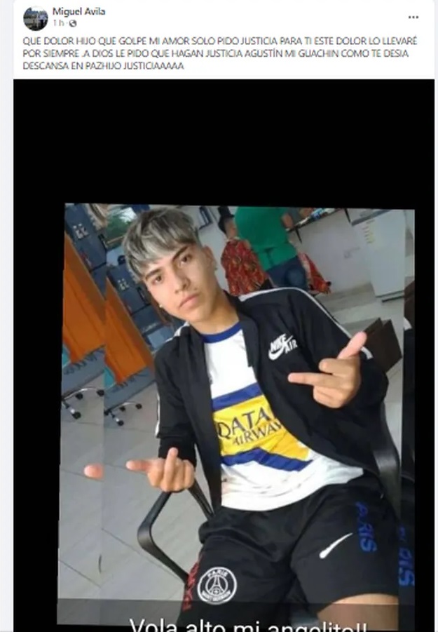 “Solo pido justicia para ti. Este dolor, lo llevaré por siempre”, continúa el posteo junto a una foto de Agustín y finaliza “le pido a Dios que hagan justicia Agustín, mi guachín, como te decía. Descansa en paz, hijo”.
