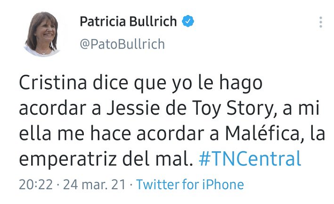 Aludida, Bullrich se vengó horas después comparando a Cristina Kirchner con Maléfica, una emperatriz villana de otra película de Disney.