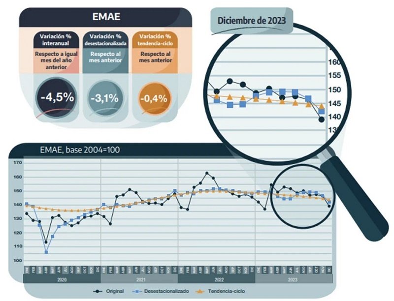 En tanto, en el último mes del año pasado la actividad mostró una baja de 3,1% respecto a noviembre en la medición desestacionalizada y del 0,4% en la serie tendencia-ciclo.