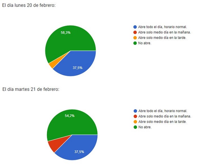 Tanto el día lunes 20 de febrero como el martes 21, entre el 54 y 58% de los comerciantes no abrirán sus puertas. En tanto, trabajará solo un 37,5%.