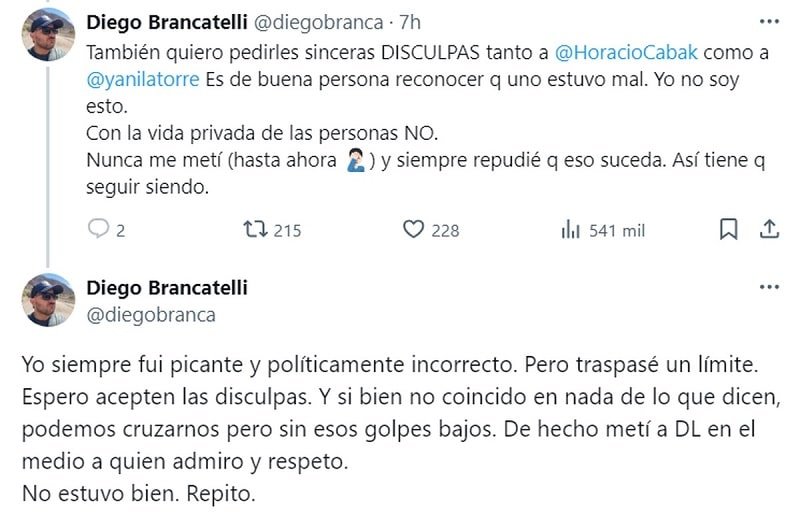 Incluso, también se disculpó con Diego Latorre, quien quedó envuelto en medio del escandalo por las palabras de Brancatelli. “De hecho metí a Diego Latorre en el medio a quien admiro y respeto. No estuvo bien. Repito“, mencionó.