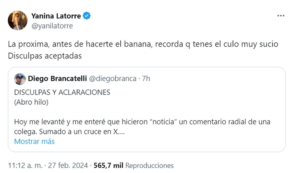 De esta forma, al ver su descargo, Yanina se expresó a través de la misma red, y aunque aceptó sus disculpas, no pudo evitar dejar un último mensaje picante. “La próxima, antes de hacerte el banana, recordá q tenes el culo muy sucio Disculpas aceptadas”, contestó.