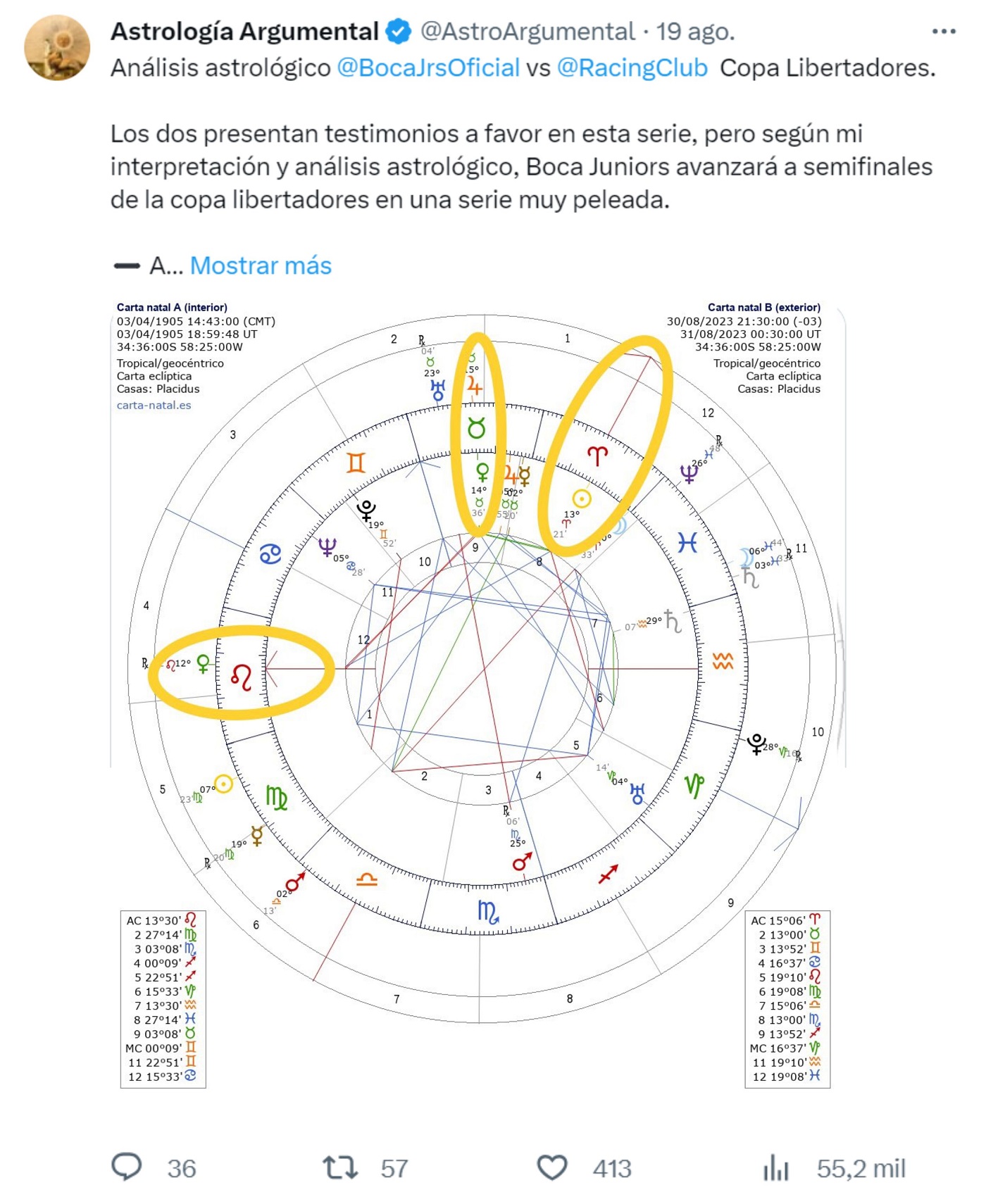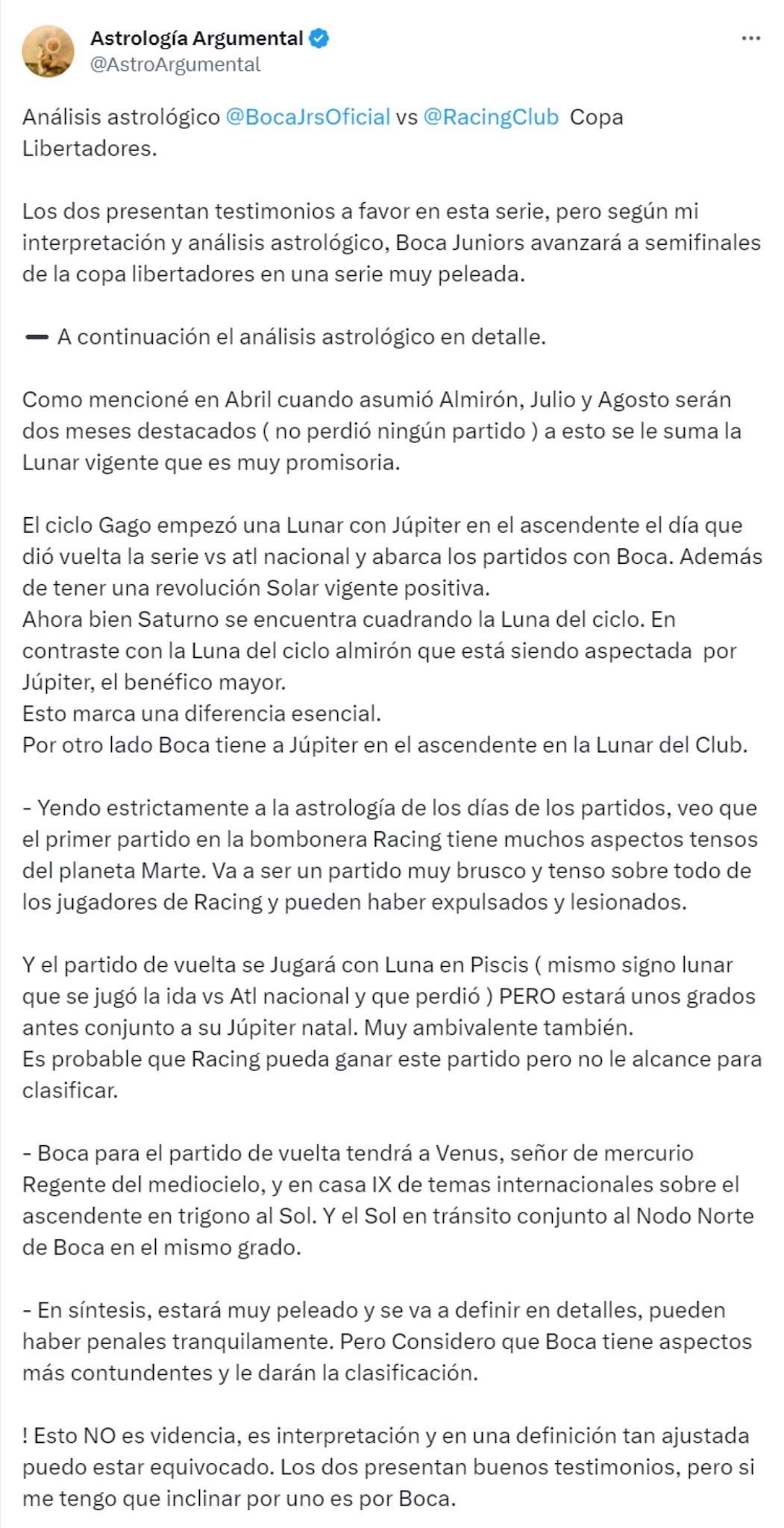 El análisis lo llevó adelante Astrología Argumental, una cuenta verificada de Twitter, quién analizó los diferentes aspectos en el cielo que beneficiarán a cada uno de los clubes. Al ganador de la fase le espera Deportivo Pereira o Palmeiras, según cómo salga la llave.