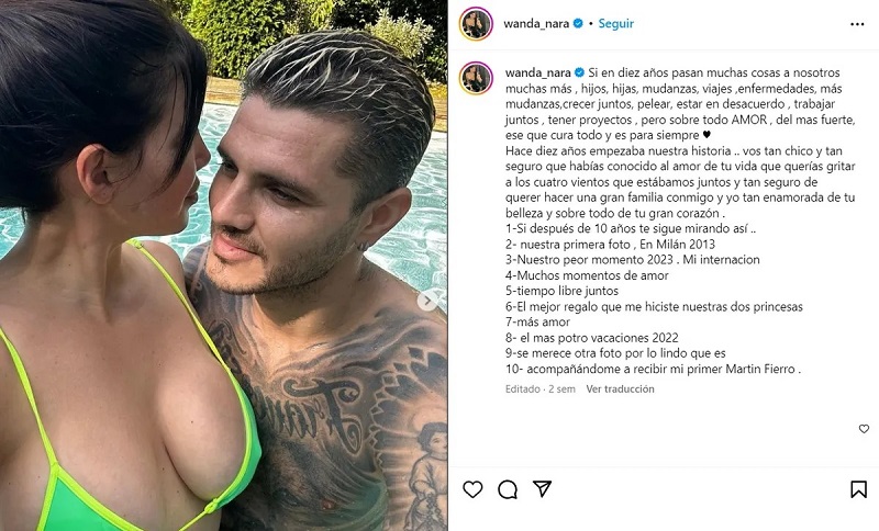 Hace unas semanas, en un romántico posteo de Instagram, Wanda Nara expresa sus sentimientos hacia su marido: “Si en diez años pasan muchas cosas a nosotros muchas más , hijos, hijas, mudanzas, viajes ,enfermedades, más mudanzas, crecer juntos, pelear, estar en desacuerdo , trabajar juntos , tener proyectos , pero sobre todo AMOR , del mas fuerte, ese que cura todo y es para siempre”.