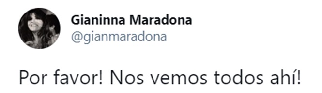 “¡Por favor! Nos vemos todos ahí”, publicó Gianinna Maradona en Twitter y compartió el afiche de la convocatoria a la marcha que se realizará el próximo 10 de marzo desde las 18.00, para pedir Justicia por la muerte de Diego Maradona, ocurrida el pasado 25 de noviembre.
