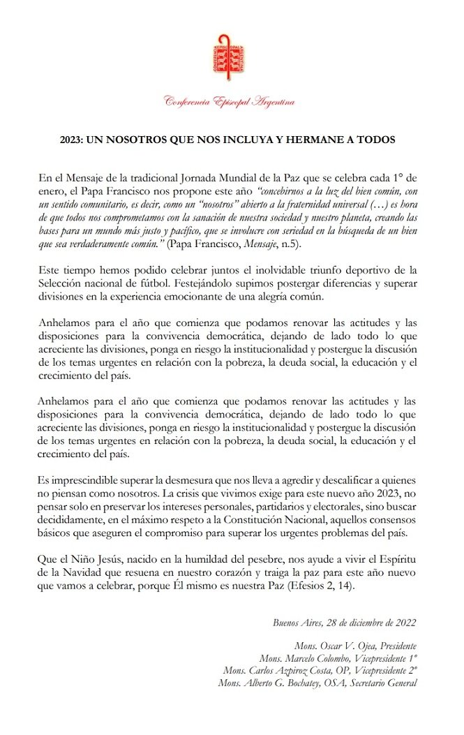 Bajo el título “2023: un nosotros que nos incluya y hermane a todos”, se trata de un escrito de cinco párrafos difundido a través del tradicional mensaje de fin de año por parte de la Conferencia Episcopal Argentina. Allí, además, el sector eclesiástico pidió que “podamos renovar las actitudes y las disposiciones para la convivencia democrática” sobre la puja entre oficialismo, oposición y el Poder Judicial.