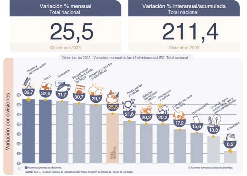 La inflación de diciembre fue del 25,5% y acumuló 211,4% en 2023