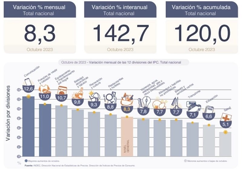 La inflación de octubre fue de 8,3 % y desaceleró 4,4 puntos porcentuales respecto al 12,7% de septiembre. De esta manera alcanza el 142,7 % interanual.