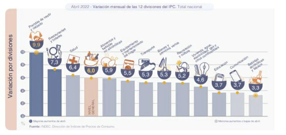 La división con mayor incremento en el mes fue Prendas de vestir y calzado (9,9%), seguida de Restaurantes y hoteles (7,3%) y Salud (6,4%). En este último caso incidió en buena medida el aumento de la cuota de la medicina prepaga.