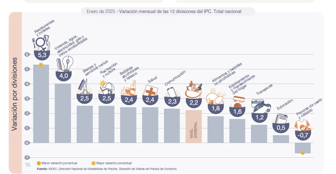 Las dos divisiones que registraron las menores variaciones en enero de 2025 fueron Educación (0,5%) y Prendas de vestir y calzado (-0,7%).