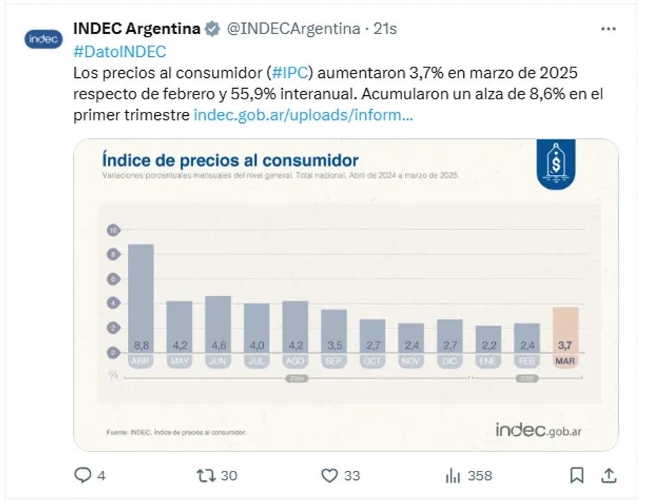 Además, el dato nacional se conoce dos días después de que la Ciudad registrara un fuerte aumento, con un índice del 3,2% para marzo, 1,2 puntos porcentuales por encima del mes anterior.