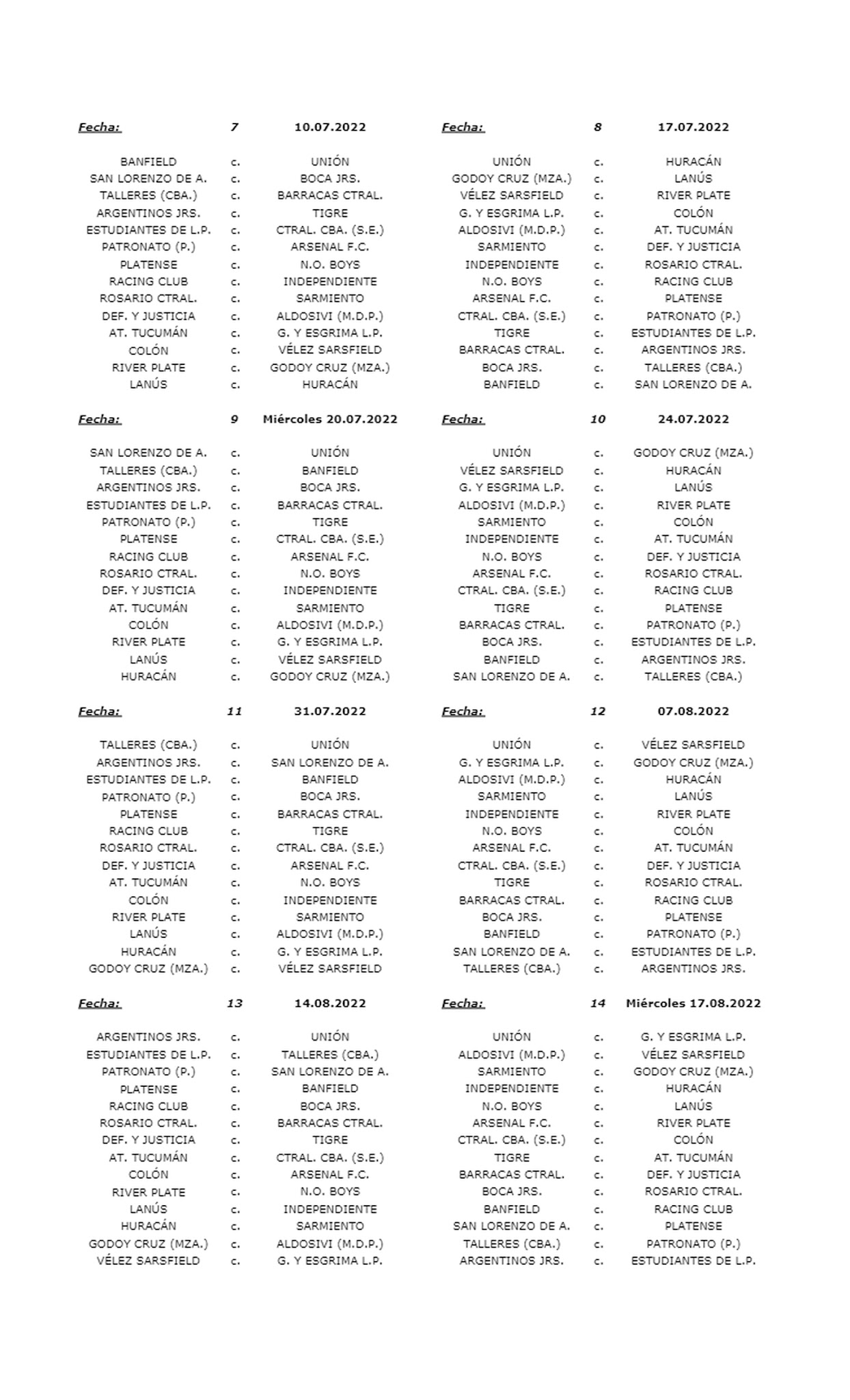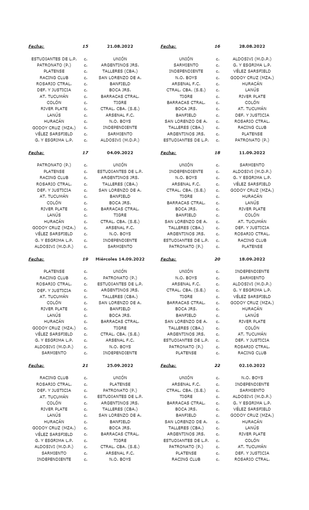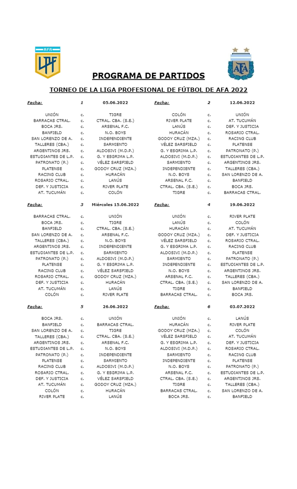 La Liga Profesional comenzará el fin de semana del domingo 5 de junio, solo con un fin de semana de receso entre un torneo y otro. Como la Copa del Mundo iniciará el 21 de noviembre y finalizará el 18 de diciembre, se decidió que la Liga Argentina 2022 culmine un mes antes, más precisamente la última fecha está programada para el fin de semana del 23 de octubre.
