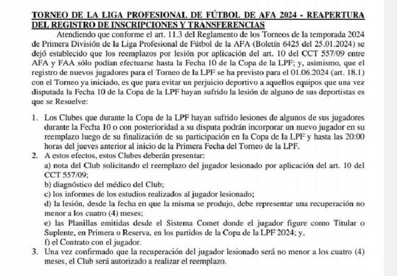 Los clubes que sufrieron la lesión de alguno de sus jugadores durante la fecha 10 y en adelante podrán contratar a un nuevo jugador desde la finalización de su participación en la Copa LPF hasta las 20:00 horas del jueves previo al arranque de la Primera Fecha de la Liga Profesional 2024, dice el comunicado de la Asociación del Fútbol Argentino.