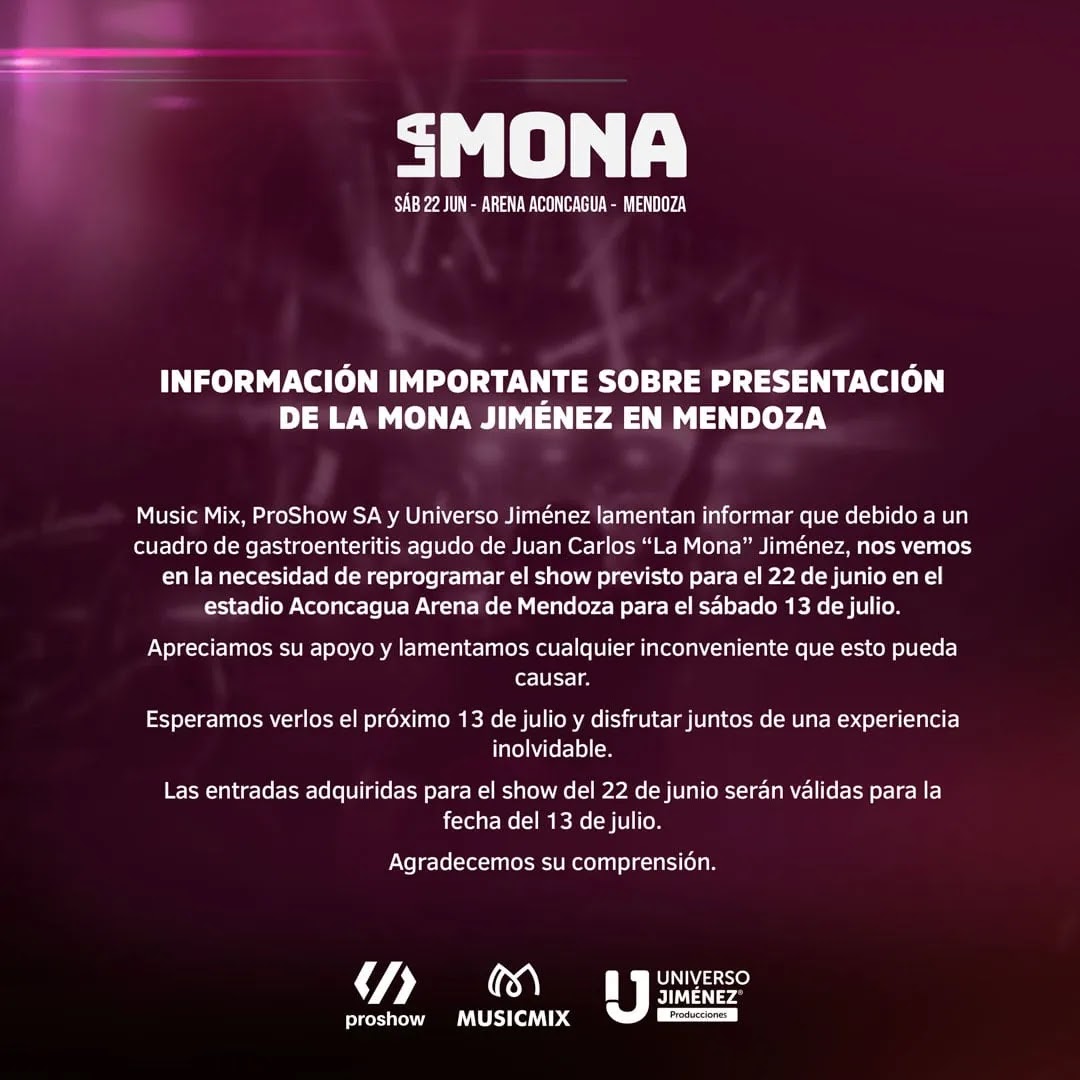 Music Mix, ProShow y Universo Jiménez lamentan informar que debido a un cuadro de gastroenteritis agudo de Juan Carlos “La Mona” Jiménez, nos vemos en la necesidad de reprogramar el show previsto para el 22 de junio en el estadio Aconcagua Arena de Mendoza para el sábado 13 de julio.