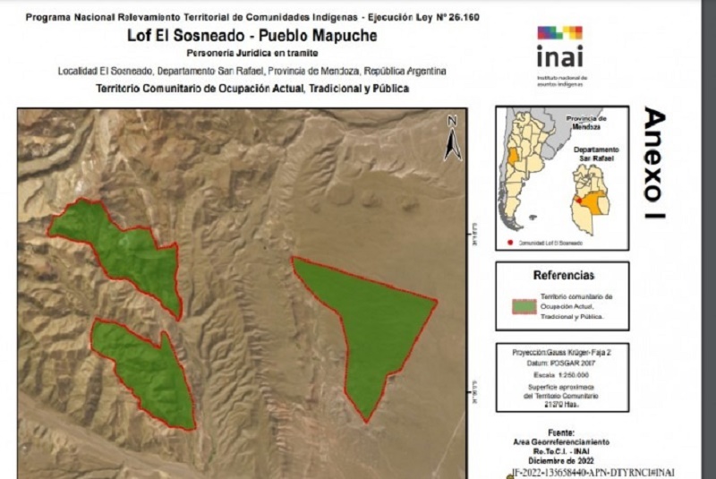 En esta resolución, finalmente se otorga personería jurídica a la organización de los presuntos mapuches, a quienes el mismo INAI les reconoció la posesión de unas 21.000 hectáreas en esta zona de San Rafael (El Sosneado) en enero de este año, cuando aún tenían la personería “en trámite”, como admitió el propio instituto.