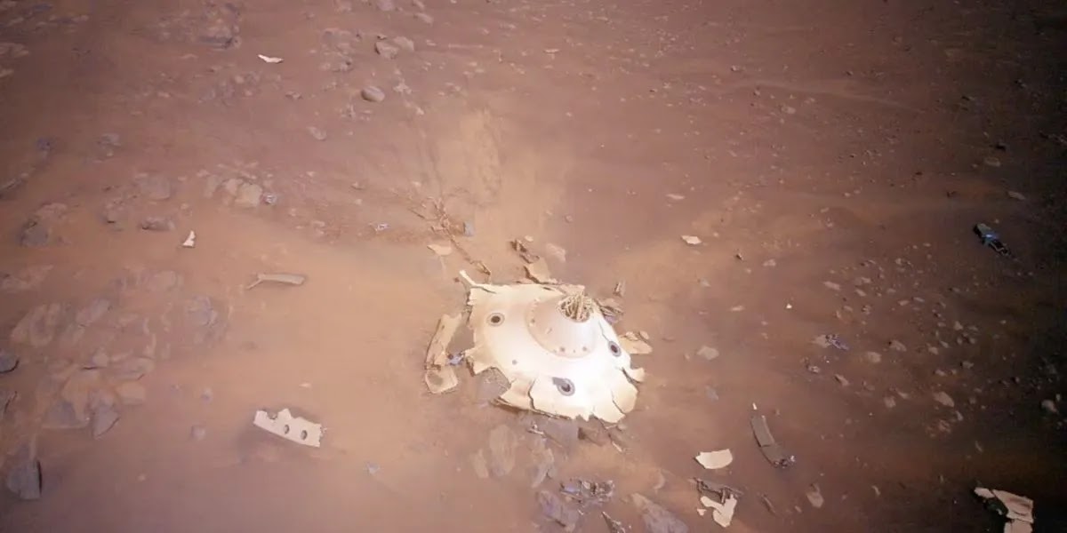 La NASA consiguió capturar una imagen de los restos de una nave espacial que se estrelló en Marte. Lo que se puede apreciar son pedazos de la cápsula espacial Aeroshell, que transportaba al rover Perseverance y al helicóptero Ingenuity hacia el planeta.