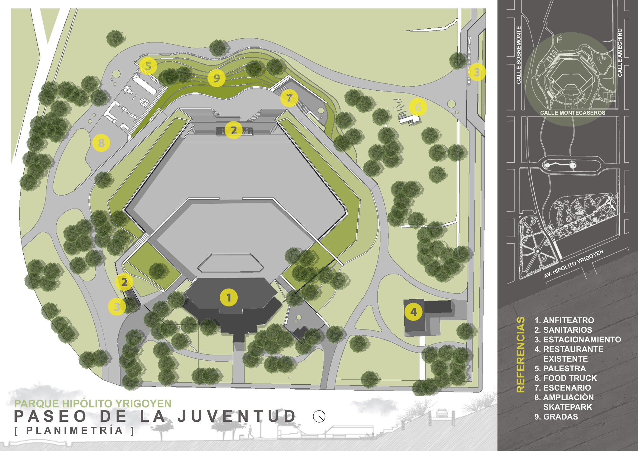 La intervención mayor se hará a las espaldas del anfiteatro ya que, aprovechando su pendiente, se ha diseñado un sector de terrazas accesibles y un escenario multipropósito, que servirá de lugar de reunión y encuentro de la juventud sanrafaelina.
