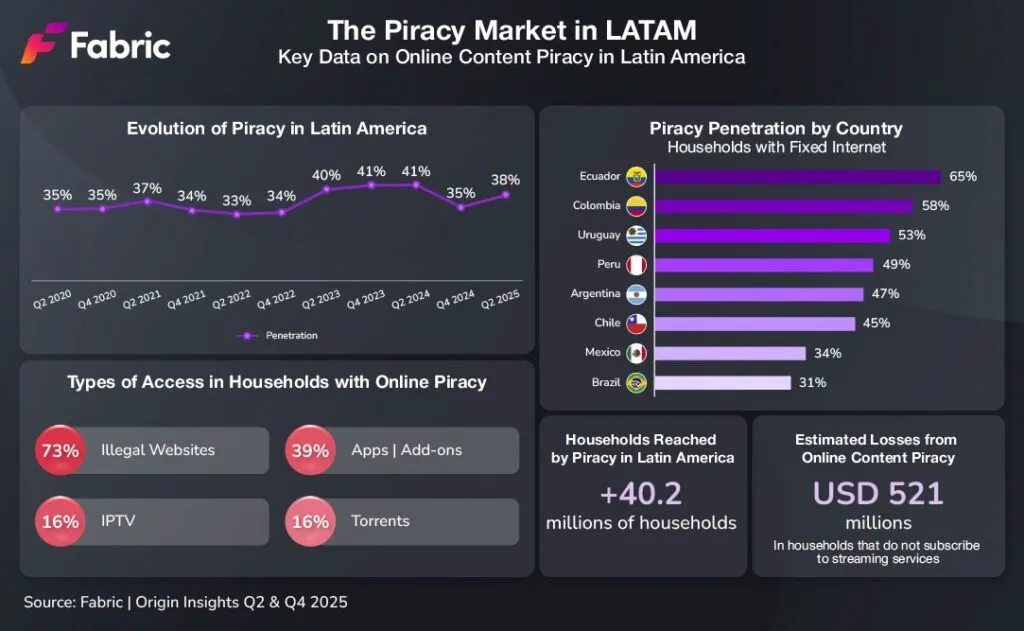 En un escenario donde la distribución digital se ha vuelto el eje del entretenimiento global, la piratería en línea continúa siendo uno de los mayores desafíos para la industria. De acuerdo con los últimos datos de Origin, a los que accedió la Agencia Noticias Argentinas, el 38% de los hogares con internet fijo en América Latina accede a contenido pirateado, lo que representa más de 40 millones de hogares en toda la región.
