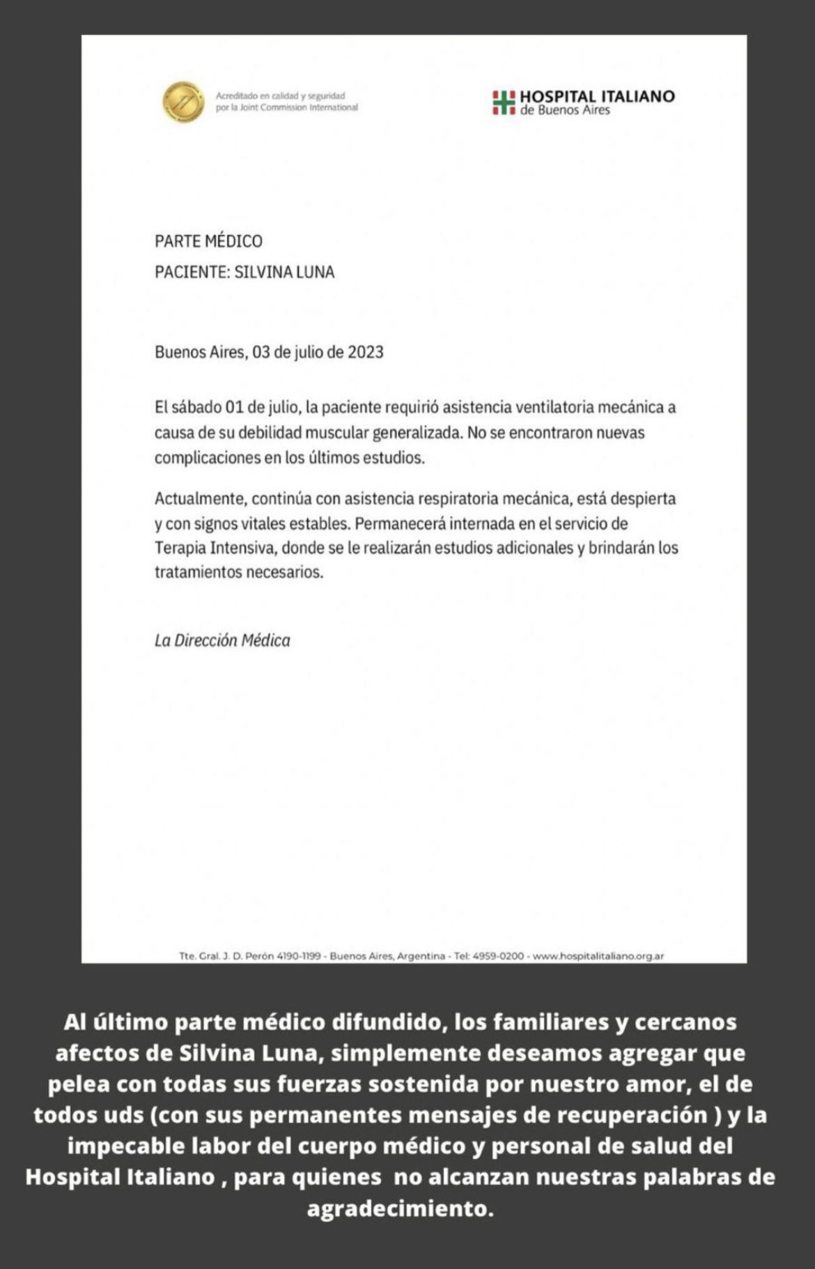 Familiares de la modelo manifestaron que Luna “pelea con todas sus fuerzas sostenida por nuestro amor, el de todos ustedes (con sus permanentes mensajes de recuperación) y de la impecable labor del cuerpo médico y personal de salud del Hospital Italiano, para quienes no alcanzan nuestras palabras de agradecimiento”.
