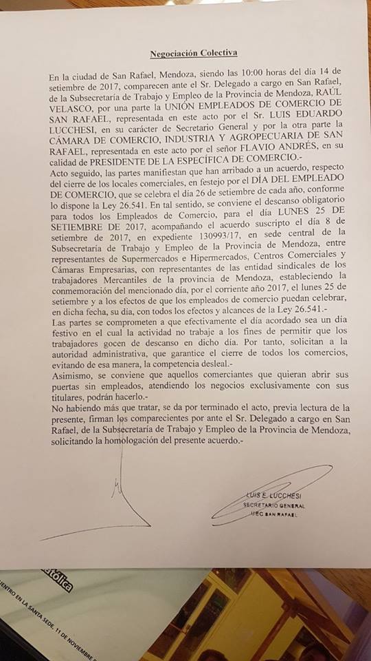 Siendo que este año el día es martes, y que ello implica cortar la semana de comerciantes y trabajadores, el Secretario General de la UEC San Rafael, Luis Lucchesi comentó al respecto: “celebramos un acuerdo con la Específica de Comercio de la Cámara de Comercio, Industria y Agropecuaria de San Rafael de modo de trasladar el día no laboral al lunes 25”.