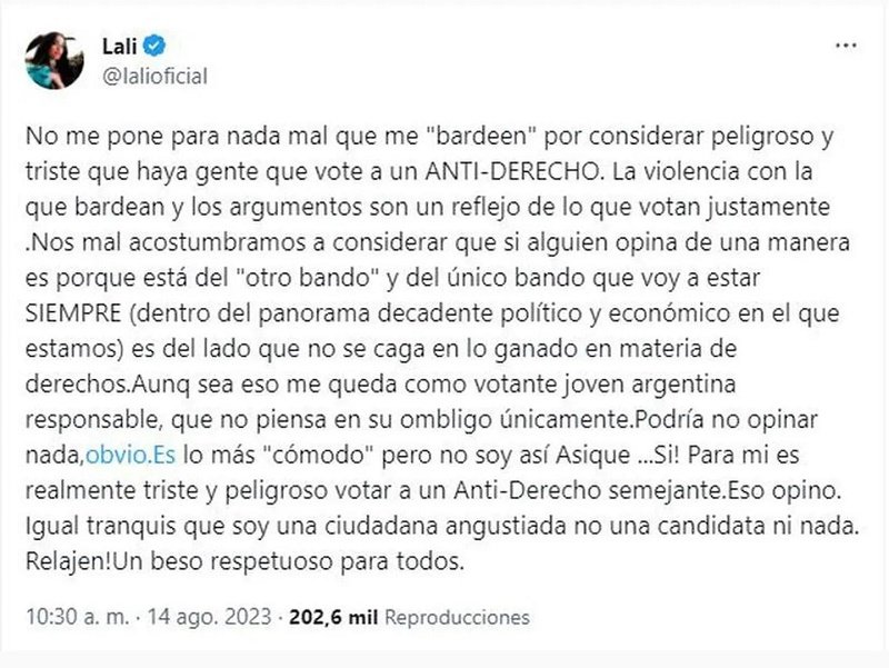 Luego, dijo que podría “no opinar nada”, algo más cómoda para ella, según expresó. “No soy así. Así que ¡Sí! Para mí es realmente triste votar a un Anti-Derecho. Eso opino. Igual tranquis que soy una ciudadana angustiada no una candidata ni nada. ¡Relajen! Un beso respetuoso para todos”, remató.
