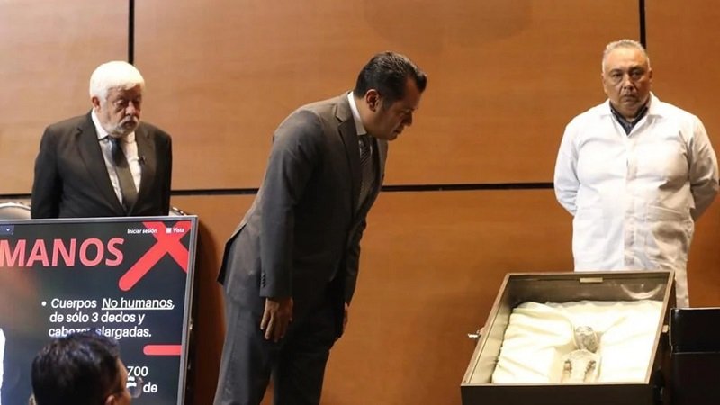 El último miércoles, el periodista mexicano presentó a dos restos momificados de presunto tamaño infantil y de procedencia ‘alienígena’ aludiendo que son prueba suficiente para respaldar la existencia de vida extraterrestre. Al lugar asistieron varios especialistas de diferentes países, incluido un piloto militar que señaló que en el aire “se pueden observar estos fenómenos”, refiriéndose a las naves extraterrestres.