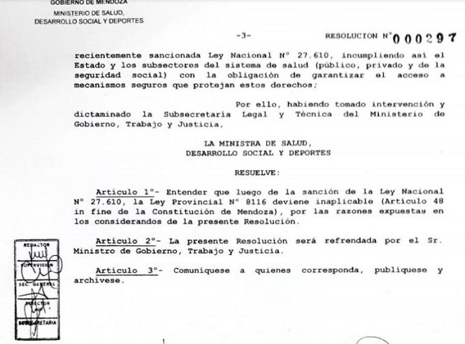 La ley de interrupción voluntaria del embarazo está vigente. El Estado mendocino ya utilizaba antes el misoprostol para los casos de interrupción legal del embarazo.