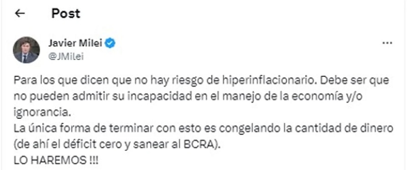 “La única forma de terminar con esto es congelando la cantidad de dinero (de ahí el déficit cero y sanear al BCRA). LO HAREMOS !!!”, enfatizó el mandatario en sus redes sociales.